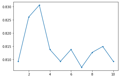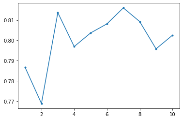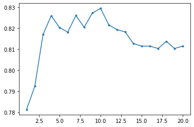 plt.plot(range(1, MAX_DEPTH+1),accuracy,'.-')