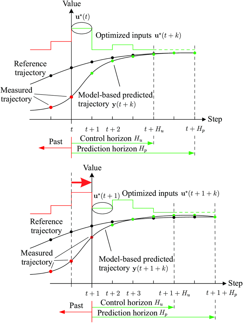 State Prediction: It utilizes the system model (state-space equation) and the calculated control sequence to predict the future system states ( $x_{[k+1\mid k]}$, $x_{[k+2\mid k]}$, $\dots$, $x_{[k+N_p\mid k]}$ ). $N_p$ is the prediction horizon.