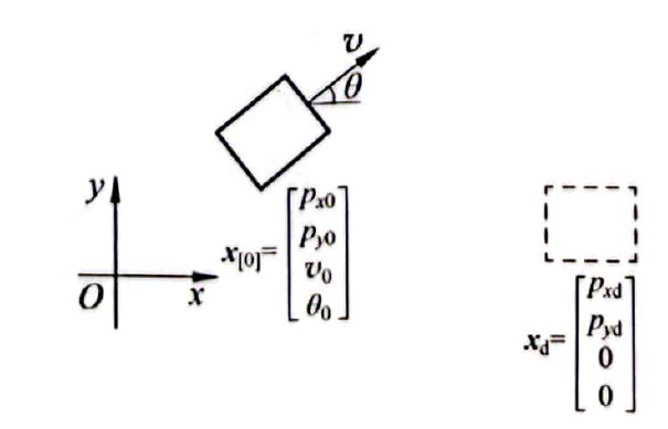 \[x_d[k]=\begin{bmatrix}p_{xd}[k]\\p_{yd}[k]\\0\\0\end{bmatrix}\]Performance function \(J=\|x[N]-x_d\|^2_S+\sum_k^{N-1}\left(\|x[k]-x_d[k]\|_Q^2+\|u[k]\|^2_R\right)\)