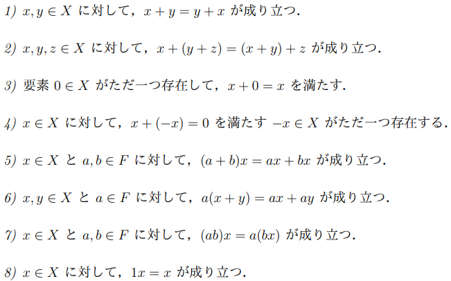 $x,\;y\in X$ および $\alpha\in F$について,$x+y\in X$ と $\alpha x\in X$が定義され,以下の公理(axiom)が満足されるとき, $X$ を 体 $F$ ( $R$ あるいは $C$) 上の線形ベクトル空間という.