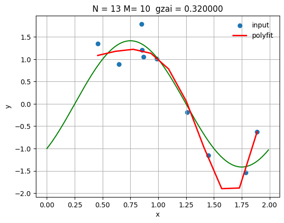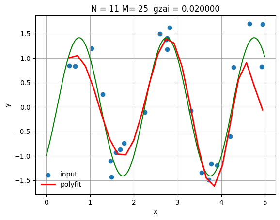 ここで$\xi=0.1$の場合,$N>11$にすると,誤差が逆に大きくなる。その理由について,正則化パラメータ$\xi$が適切ではないと考えるために,以下のように考察を行った。