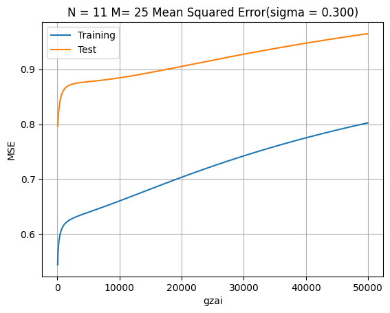$N=11$の場合で,$\xi$を考察することで,正則化パラメータが非常に小さい時(0.1),学習効果がとても良いことが分かった。しかし,この時にはテスト結果は最適ではない。正則化パラメータの増加とともに,テスト結果がよくなるが,学習効果が低下している。