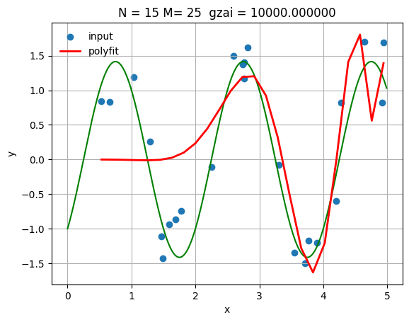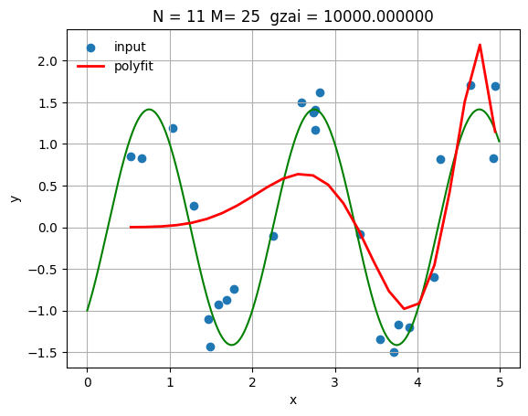 | # 正則化ミニマムノルム解を求める rmls(学習データx(x_train), 学習データy(y_train), 解空間の次元数N, 正規化定数ξ)